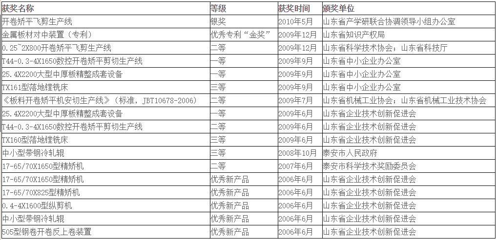 “T44-5~25.4×2200開(kāi)卷矯平移動(dòng)剪切生產(chǎn)線”入選“2010年度中國(guó)國(guó)內(nèi)首臺(tái)套技術(shù)裝備示范項(xiàng)目”,“大型數(shù)控中厚板精整成套設(shè)備產(chǎn)業(yè)化項(xiàng)目”被列入2011年山東省自主創(chuàng)新成果轉(zhuǎn)化重大專(zhuān)項(xiàng)計(jì)劃;