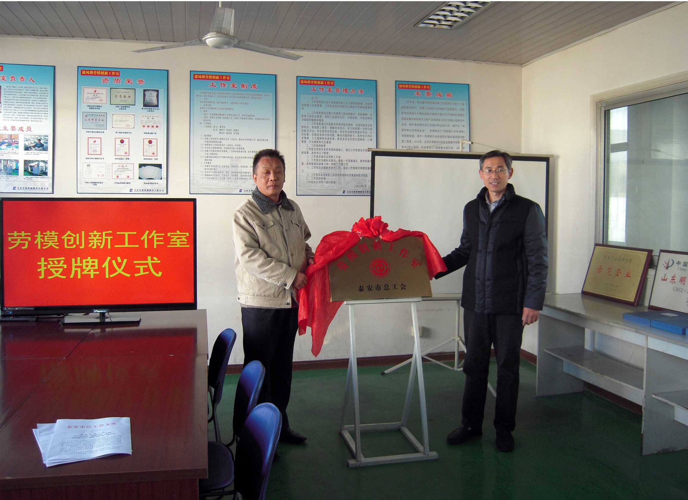 根據(jù)泰會(2014)50號《泰安市總工會關于命名第二批泰安市“勞模(高技能人才)創(chuàng)新工作室”的決定》文件精神,“康鳳明勞模創(chuàng)新工作室”被命名為第二批泰安市“勞模創(chuàng)新工作室”,這是繼今年5月份“康鳳明勞模創(chuàng)新工作室”被岱岳區(qū)總工會首批命名后取得的又一殊榮。12月5日,市總工會生產(chǎn)保護部部長劉軍、岱岳區(qū)總工會常務副主席李福江等市區(qū)部門領導來集團公司舉行了揭牌、授牌、掛牌儀式。副總經(jīng)理、工會主席聶化濤等領導參加了活動儀式。