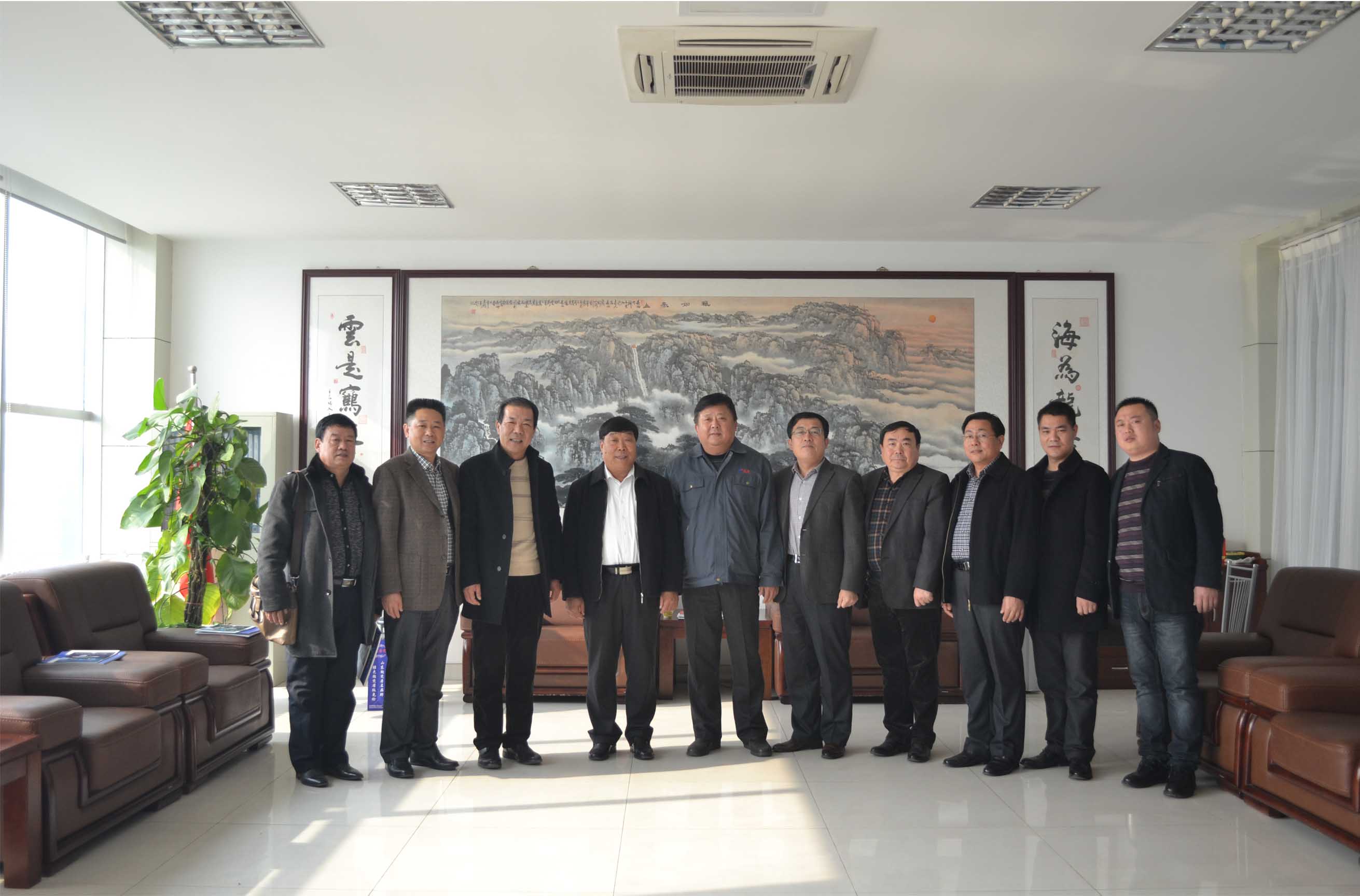 2014年11月21日,淄博市機(jī)械行業(yè)商副會(huì)長(zhǎng)、秘書長(zhǎng)張瑛明(右五)帶領(lǐng)商會(huì)骨干企業(yè)負(fù)責(zé)人來(lái)集團(tuán)公司進(jìn)行友好交流。泰安市機(jī)械行業(yè)協(xié)會(huì)常務(wù)副會(huì)長(zhǎng)、集團(tuán)公司董事長(zhǎng)、總經(jīng)理康鳳明主持與淄博市機(jī)械行業(yè)商會(huì)代表團(tuán)進(jìn)行了友好交流,泰安市機(jī)械行業(yè)協(xié)會(huì)副會(huì)長(zhǎng)、泰安市農(nóng)業(yè)機(jī)械研究所所長(zhǎng)吳修文,秘書長(zhǎng)、市農(nóng)機(jī)所副所長(zhǎng)趙文峰、集團(tuán)公司常務(wù)副總潘憲平參加活動(dòng)。
